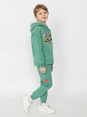 Брюки с притачным поясом и манжетами. В пояс вставлена резинка и функциональный шнур. Пояс и манжеты выполнены из полотна с эластаном. На боковых швах расположены накладные карманы с клапаном. Карман декорирован вязаной нашивкой.