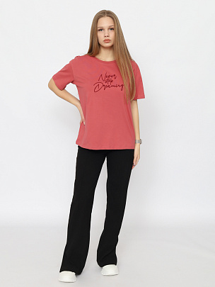 Футболка прямого силуэта длиной по линию бедер. Короткий рукав. Круглая горловина обработана узкой притачной обтачкой из рибаны с эластаном. Полочка декорирована вышивкой "никогда не переставай мечтать".