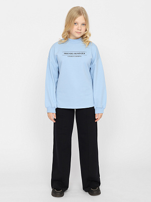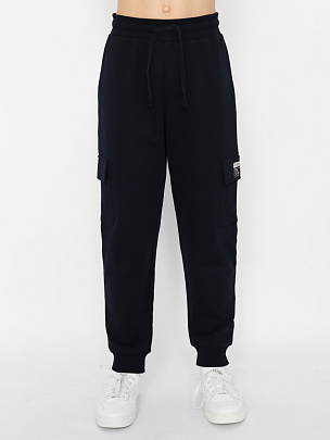 Брюки с притачным поясом и манжетами. В пояс вставлена резинка и функциональный шнур. Пояс и манжеты выполнены из полотна с эластаном. В боковой части брюк располагаются карманы. На передней части в области колена расположен декоративный подрез. На задней части брюк расположена декоративная вставка контрастного цвета. Карман декорирован вязаной нашивкой.