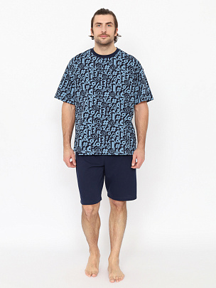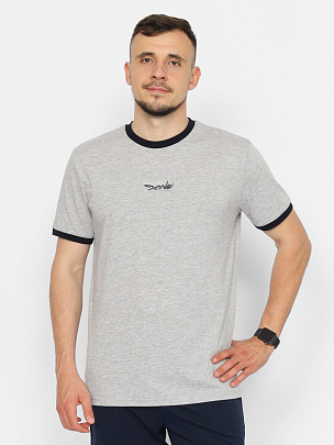 Футболка с коротким рукавом. Горловина круглая, обработана узким воротником из полотна с эластаном. Перед оформлен принтом с использованием краски с эффуктом "металлик".